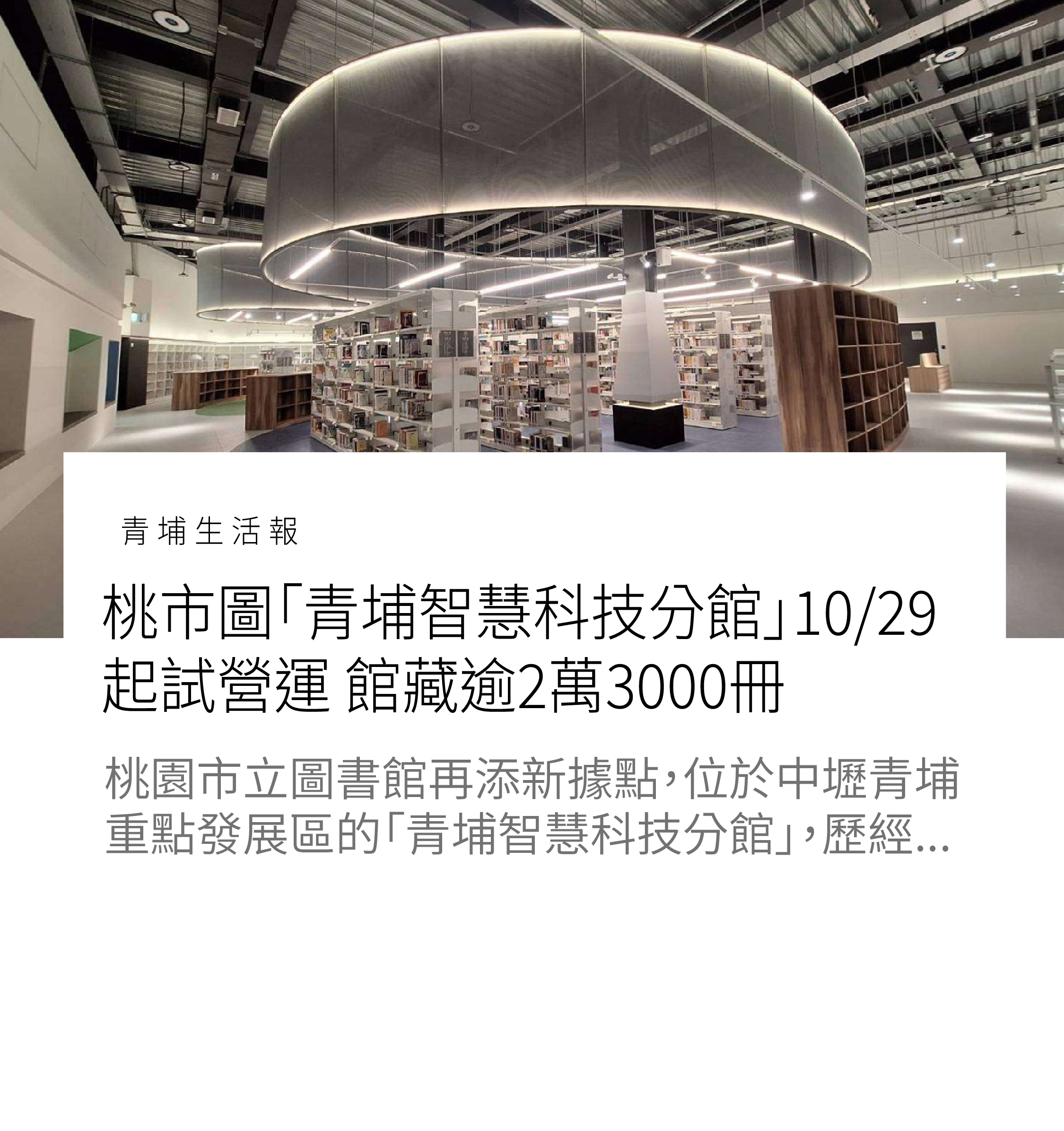 【青埔生活報】桃市圖「青埔智慧科技分館」10/29起試營運 館藏逾2萬3000冊 桃園市立圖書館 […]