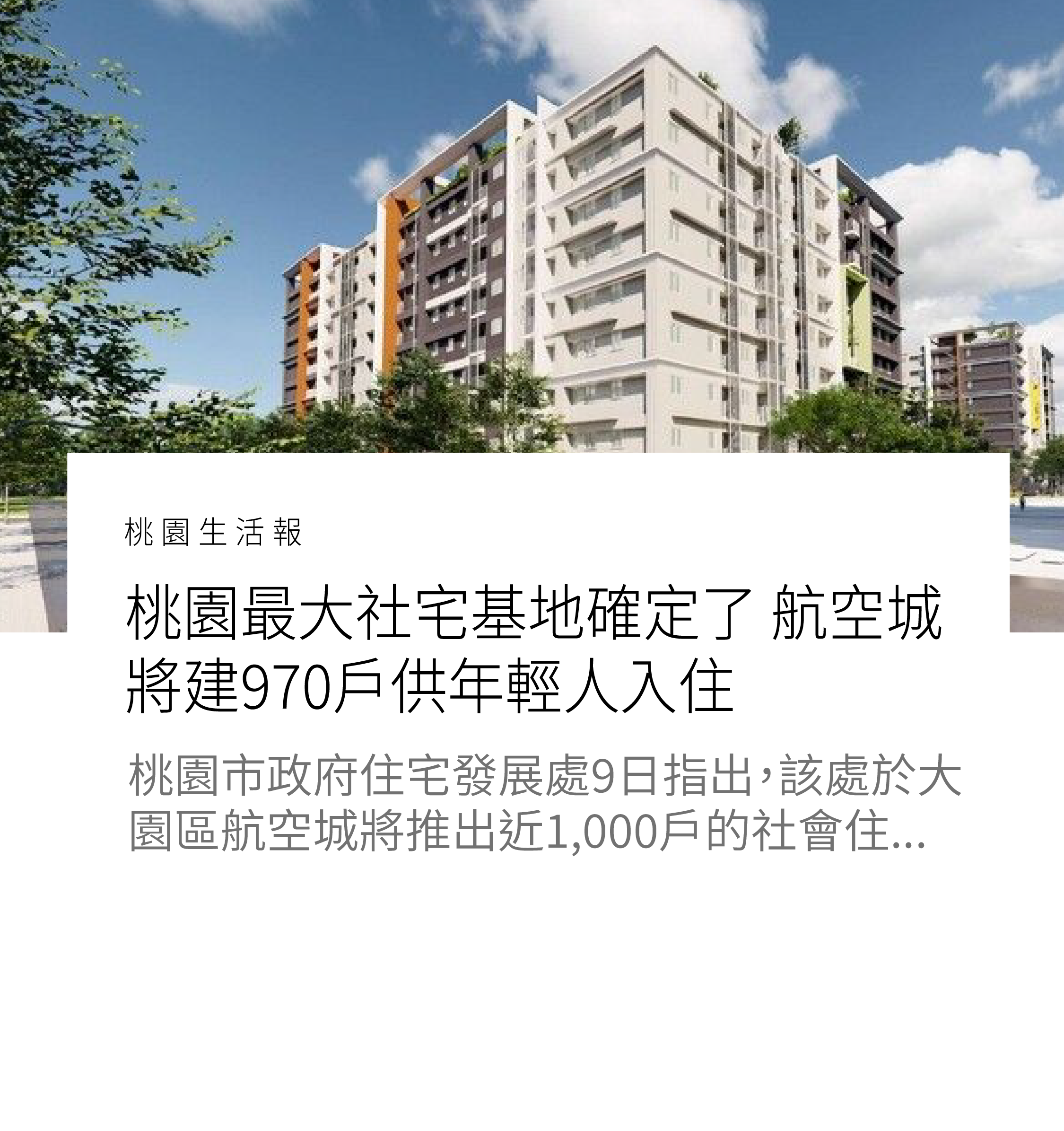 【桃園生活報】桃園最大社宅基地確定了 航空城將建970戶供年輕人入住 「大園區橫埔段社會住宅」規劃與監造案決標 […]