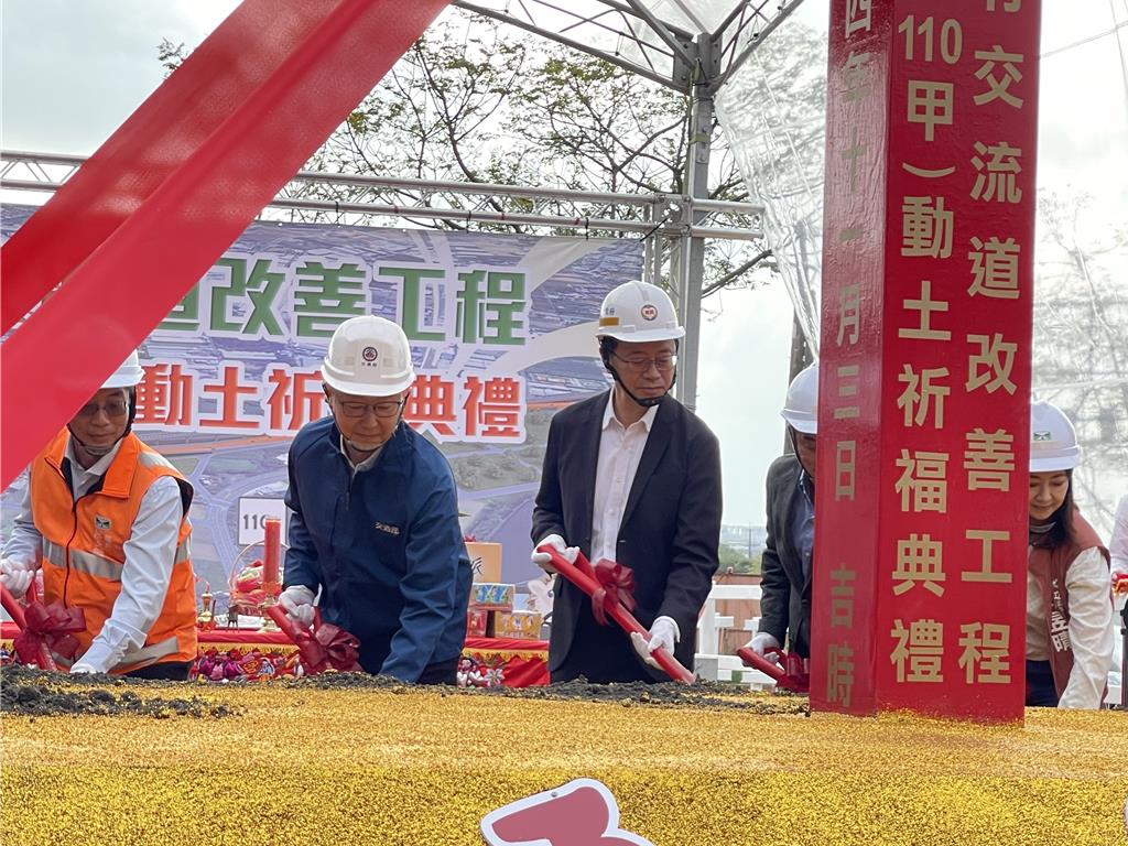 國道2號大竹交流道改善工程,3日由交通部長陳世凱(中)與桃園市長張善政(右)共同執鏟動土,預計民國118年7月完工,紓解地方交通。(呂筱蟬攝)